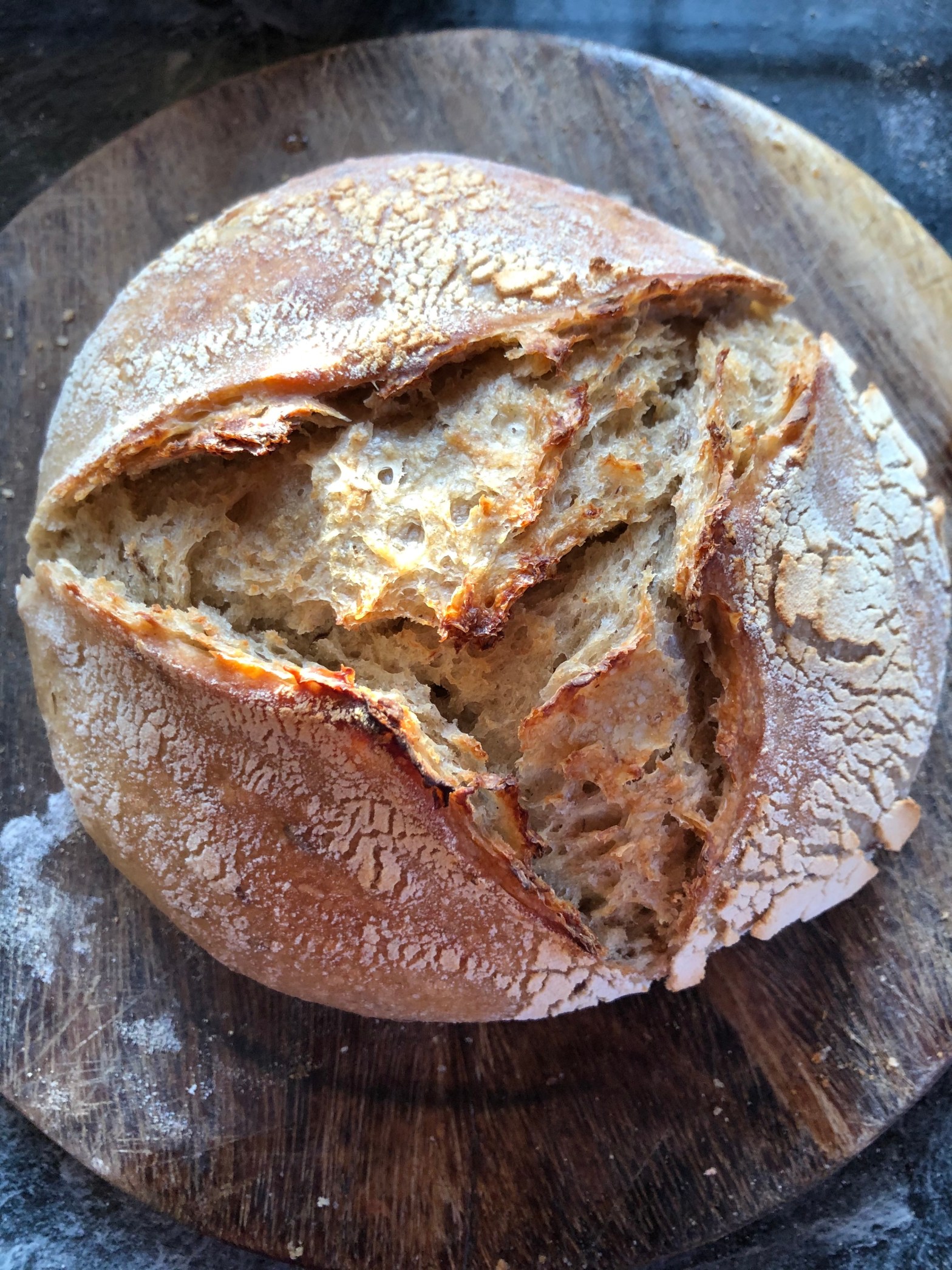 5. In the morning, turn the dough out into a casserole dish. Score in the shape of a Y. Turn the oven to 220c. No need to preheat. Take lid off after approx 30 mins. Check that the loaf has fully blossomed into a beautiful crown and leave uncovered to brown for 10 mins. If the loaf appears to be still in the process of rising, put the lid back on for 10 mins before browning off. The internal temp of loaf should be 99c when fully baked.
